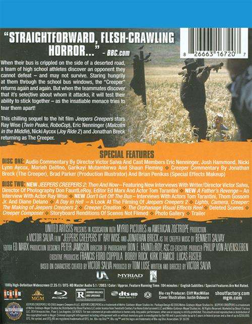 The Blu-ray: Vital Disc Stats Shout! Factory brings 'Jeepers Creepers II' to Blu-ray as a two-disc Collector's Edition package under the distributor's Scream Factory line. The two Region A locked, BD50 discs are housed inside a normal blue case on opposing panels with brand new reversible cover art and a cardboard slipcover.