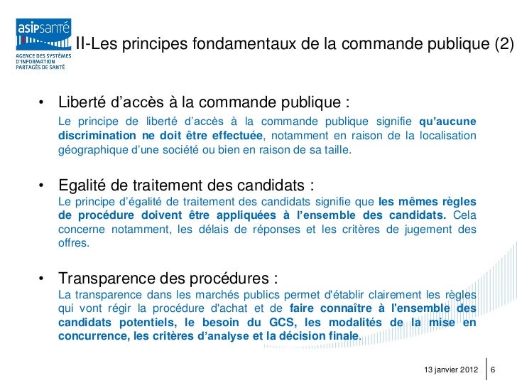 Les trois grands principes de la commande publique. D'après le Code de la commande publique, les acheteurs doivent respecter trois grands principes fondamentaux qui s'appliquent dès les premiers montants : liberté d'accès à la commande publique ; égalité de traitement des candidats ; transparence des procédures.